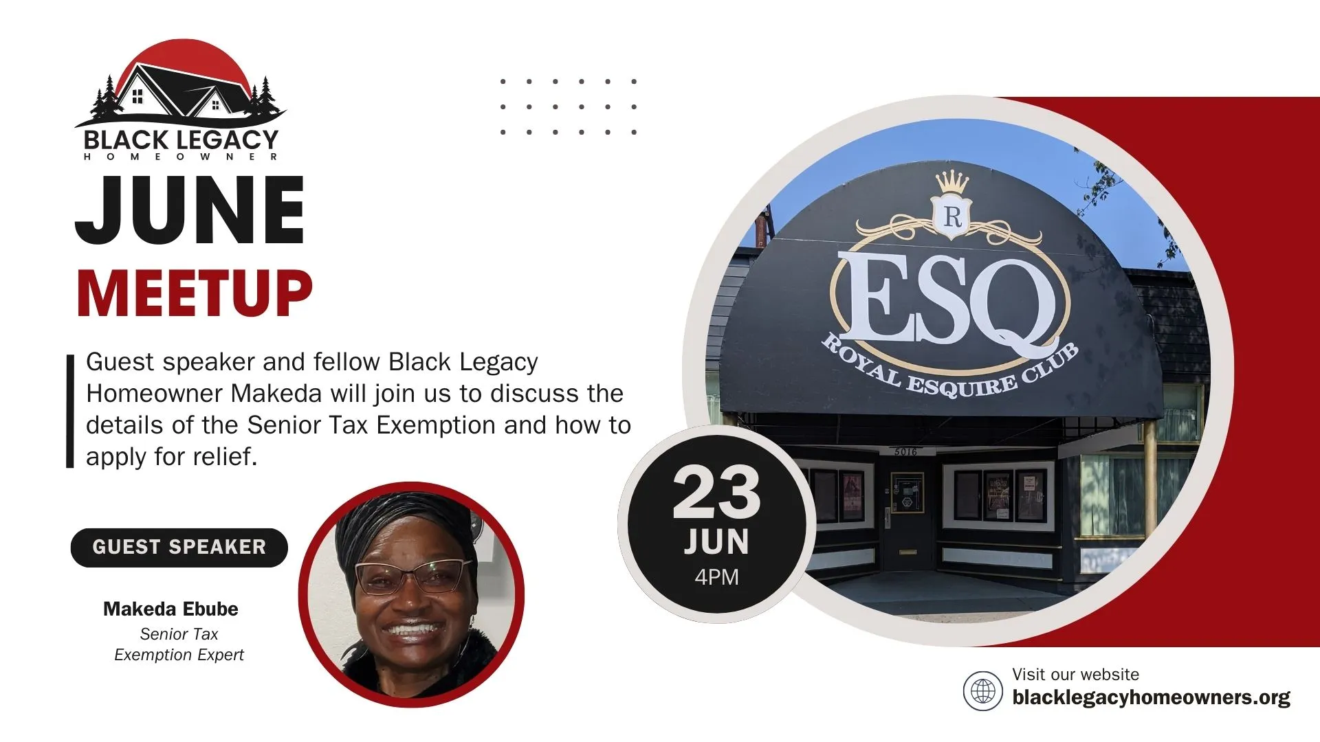 Join your fellow Black Homeowners on Sunday, June 23rd for our meetup at the Royal Esquire Club at 4PM.